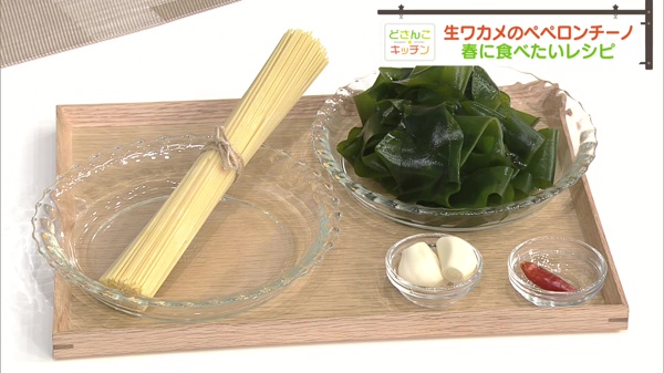 スパゲティ160g、塩適量、生ワカメ100g、ニンニク2片、唐辛子(小)1本、油大さじ1杯、スパゲティのゆで汁カップ1杯