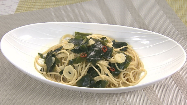(3)フライパンに油を熱してニンニクをゆっくり炒めて香りが立ったら、ワカメとスパゲティを加えて炒め合わせ、茹で汁と調味料を加えて混ぜ合わせてから器に盛ります。
