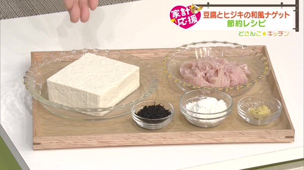 木綿豆腐1丁、ヒジキ(乾燥)4g、鶏ひき肉100g、小麦粉大さじ2杯、しょうゆ・塩・コショウ各少々、油適量