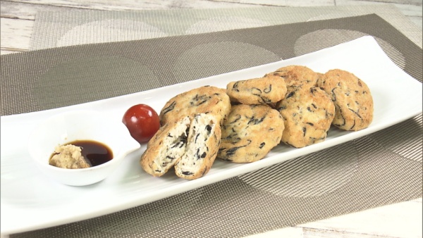 (1)木綿豆腐は平らな器にのせて、30分ほど置いて水を切ります。ポリ袋に入れて、滑らかになるまで混ぜ、鶏ひき肉、戻して水気を切ったヒジキ、小麦粉、しょうゆ、塩、コショウを加えてよく混ぜます。10等分にして丸めてから楕円形にします。