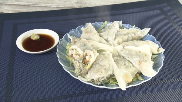 (3)(2)をスプーンですくい、シュウマイの皮にのせ、三角に折りたたむようにはさみます。深めの皿にキャベツをのせ、その上に並べます。