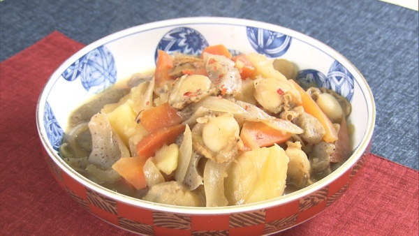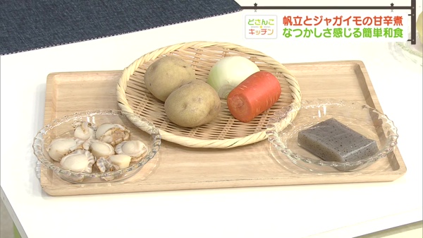 今週は、どこか懐かしい味わいの料理をお届けしています。今回は肉じゃがの「肉」を「ホタテ」でアレンジしたようなレシピ。先祖が何代にもわたって食べ継がれた結果、自分自身の体に食べた事のある懐かしい味として蘇ります。以前STVの料理担当者に、古い料理を作って食べてもらった所、初めて食べたのに「懐かしい味!」と言われたことがありました。