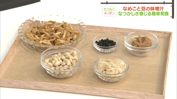 なめこ1袋、水煮大豆カップ1/2杯、乾燥ワカメ大さじ1杯、鮭節ひとつまみ、水カップ2杯