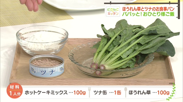 ホットケーキミックス100g、ツナ缶1缶、ほうれん草100g、塩・油少々、黒コショウ少々、水大さじ2杯、油大さじ1杯
