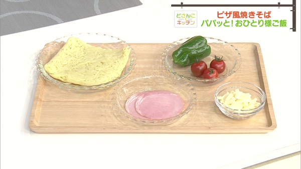 焼きそば1玉、油大さじ1/2杯、ロースハム2枚、ピーマン1個、ミニトマト3個、シュレットチーズ30g