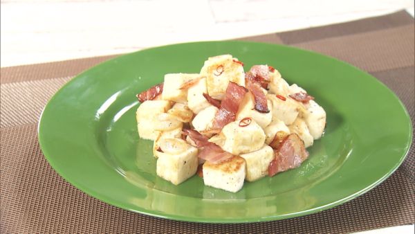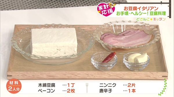 (1)豆腐は使う30分前に冷蔵庫から出し、平らな器に入れて水切りし、2cm角に切ります。ベーコンは1cm幅に切り、ニンニクは薄切り、赤唐辛子は、種を取って輪切りにします。