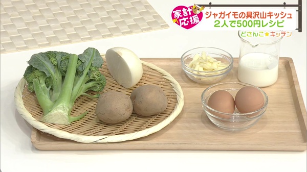 キッシュ生地…卵2個、牛乳100cc、シュレッドチーズ30g、塩小さじ1/2杯、コショウ適量