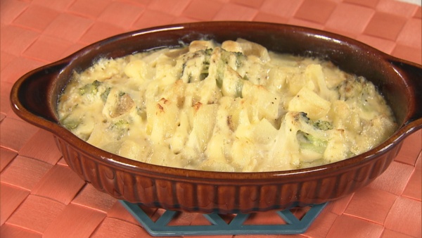 (1)ジャガイモは、よく洗って皮付きのまま1cm幅に切ります。鍋にひたひたの水と、塩をひとつまみ入れます。玉ネギは、横半分に切ってから千切りにし、ジャガイモに加えます。ブロッコリーは一口大の小房に分けて、玉ネギとジャガイモの入った鍋に入れ、中火で蒸し煮します。