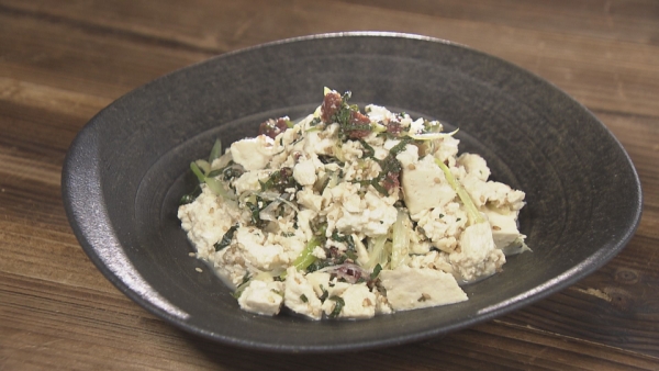 (3)フライパンに油を熱して長ネギ、白ゴマ、豆腐を入れて焼きます。豆腐が熱くなったら調味料を加えて混ぜ、火を止めてから青シソと梅干しを入れて混ぜ合わせてから盛りつけます。