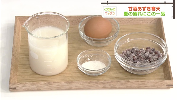甘酒190ml、粉寒天2g、卵1個、小豆甘納豆40g