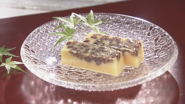 (3)(1)の粗熱がとれたら、甘酒に卵を少しずつ加えながら混ぜて型に流し、上から甘納豆を平均に入れて冷やします。