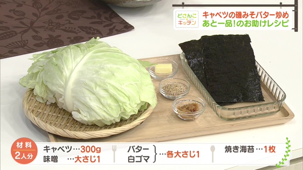 キャベツ300g、油大さじ1杯、塩少々、みりん大さじ2杯、味噌大さじ1杯、バター大さじ1杯、白ゴマ大さじ1杯、焼き海苔1枚