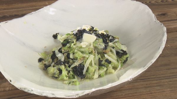 (2)キャベツの色が鮮やかになったら、味噌、バター、白ゴマを加えて混ぜて火を止め、焼き海苔をちぎって加えます。