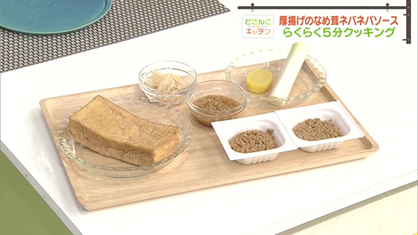 厚揚げ1枚、油大さじ1/2杯、なめ茸瓶詰め小1/2本、ひきわり納豆2パック、長ネギ1/4本、たくあん20g
