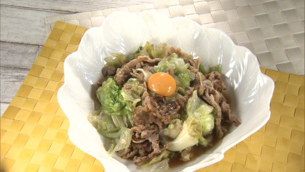 (4)豚肉に火が通ったら、レタスの芯を外して一口大にちぎって入れ、調味料を入れて、炒め合わせて器に盛り、上に卵黄をのせます。