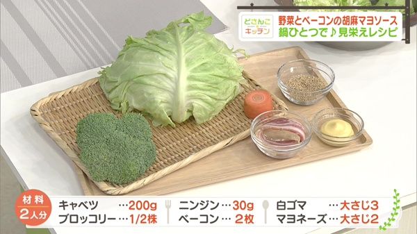 キャベツ200g、ブロッコリー半株、ニンジン30g、ベーコン2枚、オリーブオイル・水各大さじ1杯、酒大さじ2杯、コショウ少々