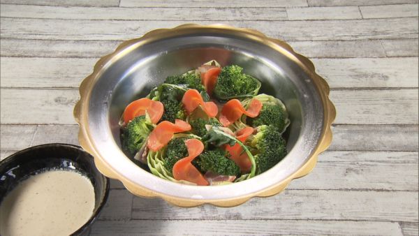 (1)キャベツは、芯を外してくるくると巻いて、3cmほどの幅に切って、鍋に立てて並べます。ブロッコリーは小房に分けて、巻いたキャベツの中心に立てます。ニンジンは薄い輪切りにして、上に並べます。