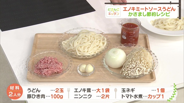 うどん2玉、豚ひき肉100g、塩・酒・コショウ各少々、エノキ茸大1袋、ニンニク2片、玉ネギ1個、油大さじ1杯