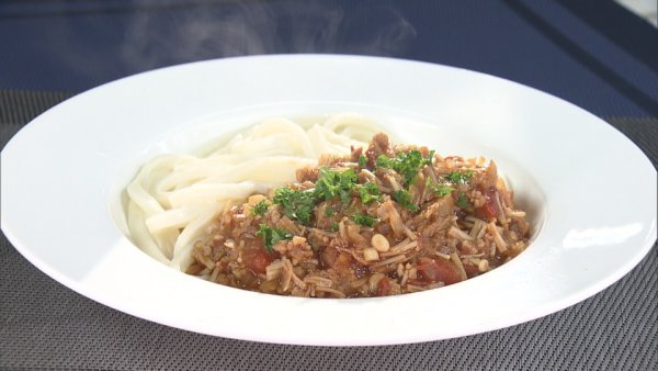 (4)深い皿にうどんを盛り、(3)のエノキミートソースをかけ、パセリのみじん切りをあしらって頂きます。