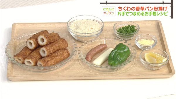 ちくわ6本、ウインナー1本、さけるチーズ1本、ピーマン1個、パン粉カップ1杯、パセリのみじん切り大さじ2杯、粉チーズ大さじ1杯、塩小さじ1/3杯、コショウ適量、油適量
