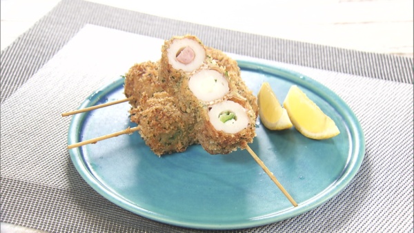 (3)ちくわをバッター液にくぐらせてパン粉をつけ、180℃の油でキツネ色に揚げて油を切り、レモンを絞って頂きます。