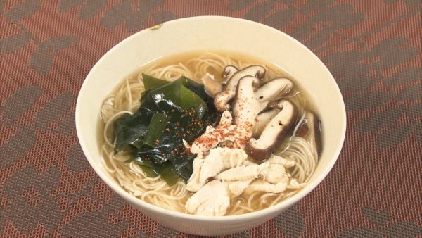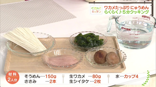 そうめん150g、鶏ささみ2本、生ワカメ80g、生しいたけ2枚、水カップ4杯
