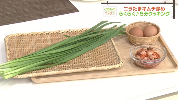 ニラ1束、白菜キムチ100g、卵2個、みりん大さじ2杯、塩少々、油大さじ2杯