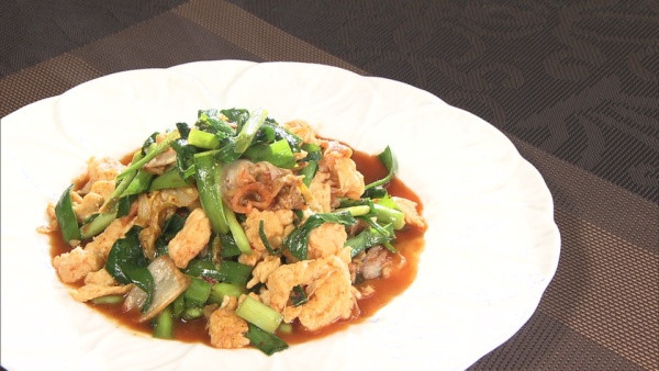 (4)ニラがしんなりしたら調味料を入れて絡め、炒り卵をフライパンに戻し、混ぜて仕上げます。