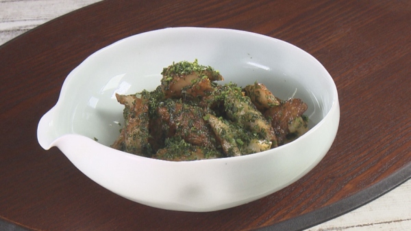 (2)フライパンを熱し、ちくわとマヨネーズを入れて炒め、ちくわが膨らんできたらしょうゆを加え、最後にたっぷりの青のりを加えて絡めます。