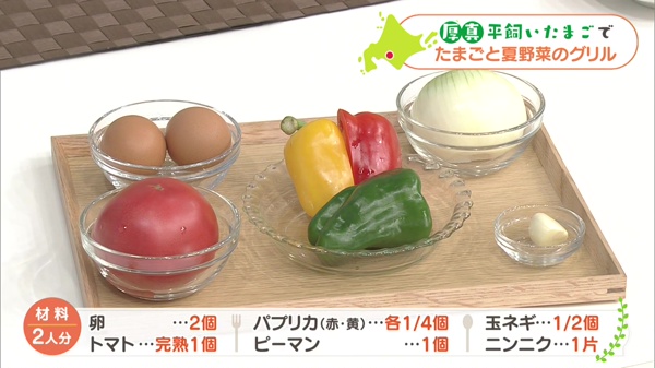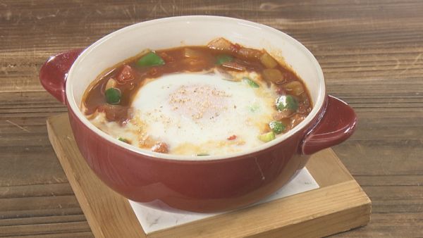 フレッシュトマトでパプリカや玉ネギを煮たソースの上に、卵をのせて焼きます。夏野菜に卵が加わることで、大変コクのある味わいになり、栄養価もアップします。地元の素材で体を元気に保ち、美味しく食べて優秀な食材が近くで生産される喜びをかみしめたいものですね。
