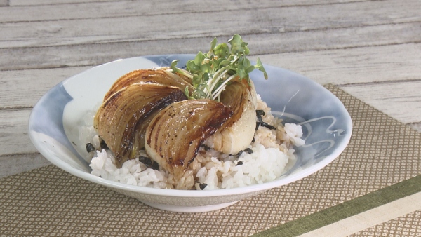 (3)ごはんを器に盛り、焼き海苔をちぎってのせて、玉ネギの焼いた面を上にして盛り付けます。