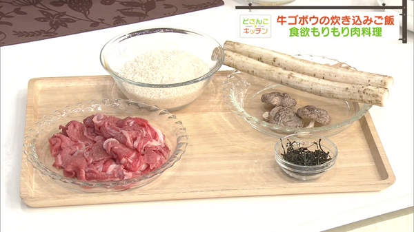 米2合、水+煮汁カップ2杯、牛コマ切れ肉200g、ゴボウ1本、干シイタケ3枚、細切り昆布ひとつまみ、油大さじ1杯
