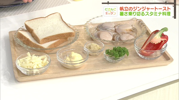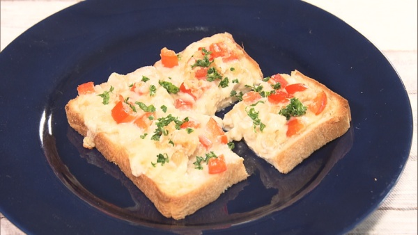 (2)ホタテ、赤パプリカ、シュレッドチーズを、おろしショウガと調味料で和えます。パンに均等にのせ、オーブントースターで焼きます。