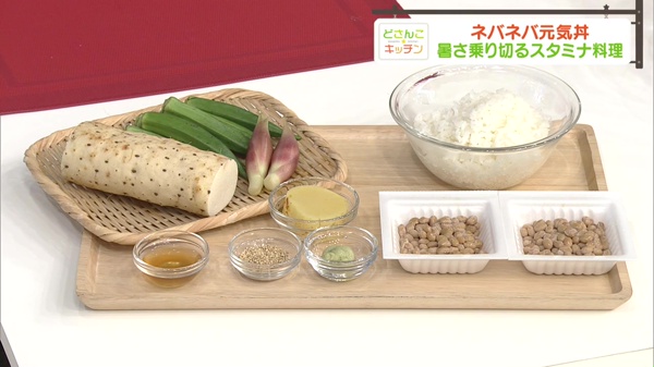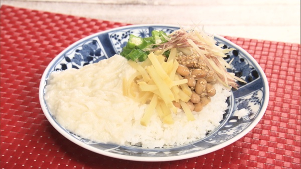 長イモといえばスタミナ野菜の代名詞ですが、その食感でご飯も一緒に、たっぷり食べられるのが魅力。今回はワサビやたくあんで、香りと食感をプラス。ミョウガといった香味野菜も入れて、爽やかさもアップさせました。納豆やオクラといったネバネバ食材も一緒に入れて、元気になる事請け合いの丼になりました。