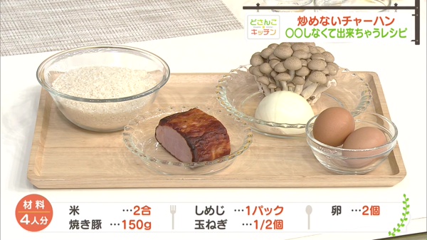 米2合、水2合分、油大さじ2杯、焼き豚150g、しめじ1パック、玉ネギ1/2個、卵2個