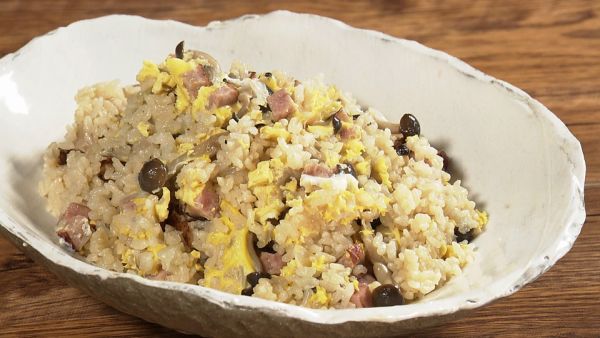 (4)炊けたら溶き卵を回し入れ、再び蓋をして、卵が固まるまで、5分ほど蒸らし、へら返しして盛ります。