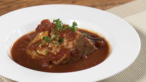 (4)上下を返して、更に20分煮て味を染ませ、食べ易く切り分け、パセリのみじん切りをあしらいます。