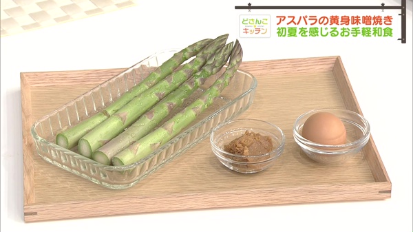 (2)味噌に黄身とてんさい糖を混ぜ、並べたアスパラにのせて、オーブントースターで火が通るまで焼きます。