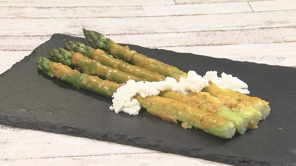 (4)焼けたアスパラを皿に盛り、炒り卵を添えます。