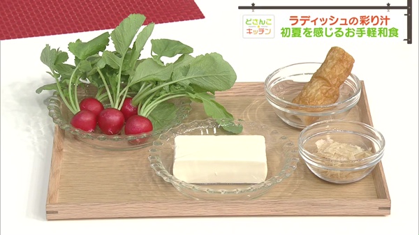 (1)ラディッシュは葉を外し、身はこすり洗いして薄切りにし、葉は水に浸してパリッとさせてから3cm長さに切ります。豆腐は1cm角に、ちくわは薄い輪切りにします。