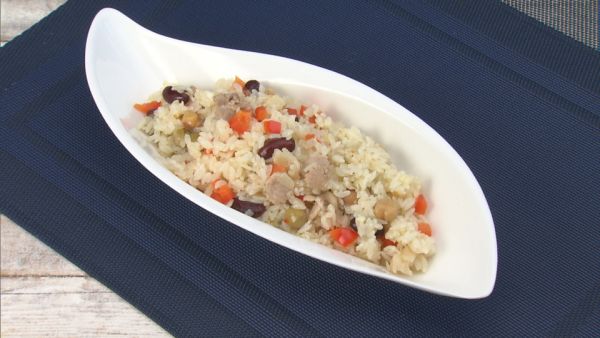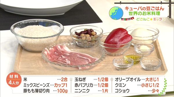 今週は、世界のコメ料理を作ります。普段馴染みのない各国の料理は、大変興味深いものがあります。世界の半数が米食文化と言われていますので、ある材料で作り易い形にアレンジしてお届けします。はじめにキューバの「アリースコングリ」という豆ごはんです。本場では、豆は黒豆などを茹で汁ごと使いますが、この度は手軽になる様、ミックスビーンズを使って作ります。