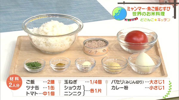 ご飯2膳、ツナ缶1缶、トマト中1個、玉ネギ1/4個、ショウガ・ニンニク各1片、パセリのみじん切り大さじ1杯、油大さじ1杯