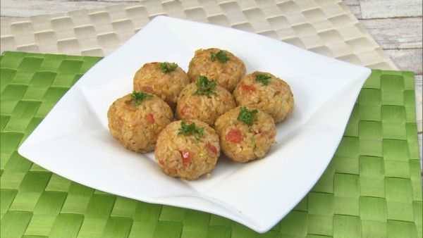 (3)8個に丸め、パセリのみじん切りをのせます。