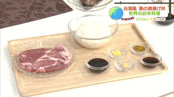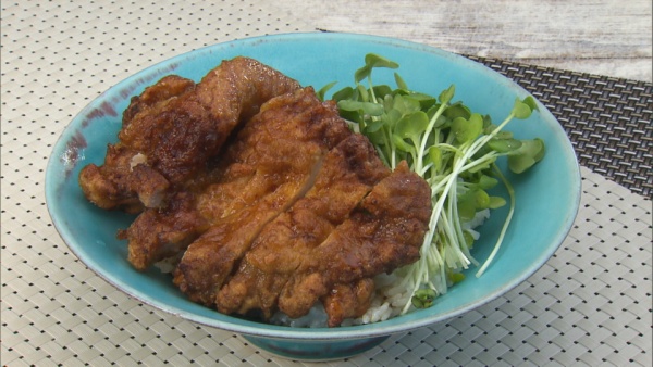 (2)(1)のポリ袋の中に、片栗粉を入れて肉にまぶします。180℃の油でカリッと揚げ、一口大に切ります。器に盛ったご飯の上に、肉を並べます。