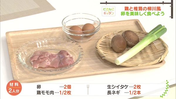 卵2個、鶏モモ肉1/2枚、油大さじ1杯、生シイタケ2枚、長ネギ1/2本、水カップ1/2杯