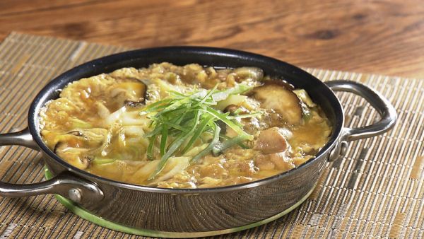 (3)材料に火が通ったら卵を溶いて流し入れ、蓋をして火を止め、半熟に仕上げます。最後に、長ネギの青味部分をあしらいます。