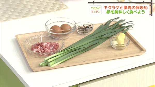 卵2個、塩・みりん各少々、豚コマ切れ肉100g、しょうゆ・酒各少々、乾燥キクラゲ3g、ニラ1束、ニンニク1片、ショウガ1片、ゴマ油大さじ2杯