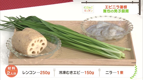 (1)レンコンは皮をむいて半月に切ります。エビは塩とコショウをして、酒をまわしかけ、片栗粉をまぶしておきます。ニラは水に放してパリッとさせて3cm長さに切ります。調味料は合わせておきます。