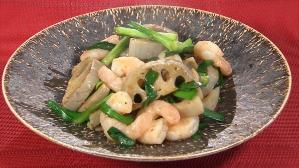 (2)フライパンに油を熱し、レンコンとエビを入れて炒めます。