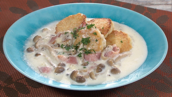 (4)空いたフライパンにシメジ、ベーコンを入れて炒め、牛乳、(1)のシュレッドチーズ、塩を加え、軽く煮てトロミがついたら、(3)の器に盛りつけ、パセリのみじん切りをあしらいます。
